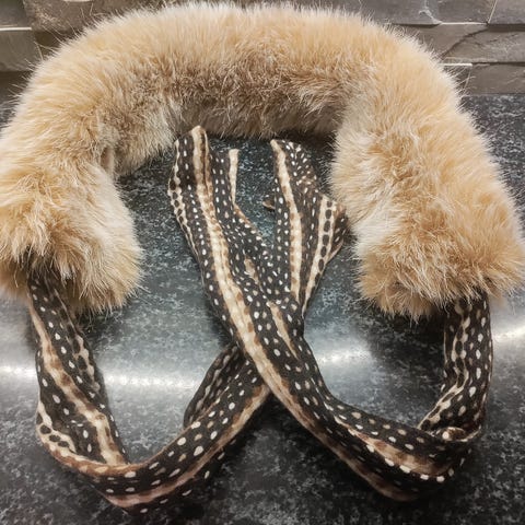 Vintage kettupuuhaka tassuilla. Pituus 115 cm lev 15 cm nepparikiinnitys.