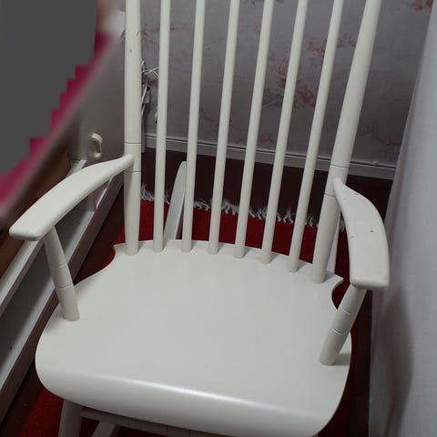 Vanha musta keinutuoli, vaatii pientä korjausta.