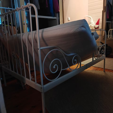 Mikäli sängystä haluaa pinnasängyn, tulee kuvassa näkyvän korkean laidan kiinnittämiseksi hankkia yksi puutappi kadonneen alkuperäisen tilalle.