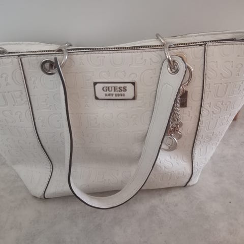 Olkalaukussa on ketjuhihna ja sen ulkopuolella on GUESS-logo.