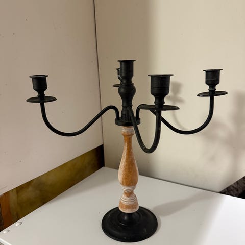 Viiden kynttilän kyntteleikkö. Korkeus 70 cm, leveys 73 cm jalan mitta 30 cm.