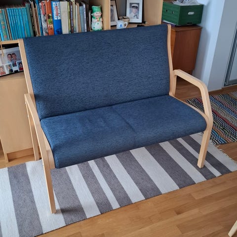 Siro, kaunis sohva, joka mahtuu hyvin pienempäänkin paikkaan. Hyväkuntoinen, tammi, kangasverhoilu.