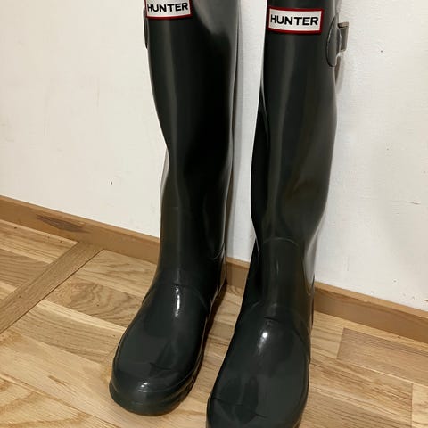 Hunterin pitkävartinen kumisaapas. Koko 40. Kengän pohjan pituus n.28,5 cm. ( ulkopohjasta mitattuna) Kengän korkeus korkosta varren yläosaan n.43 cm. Kumisaapas on napakka malli. Hyväkuntoinen, kumisaappaassa vähän käytön jälkiä ( näkyy kuvassa)
