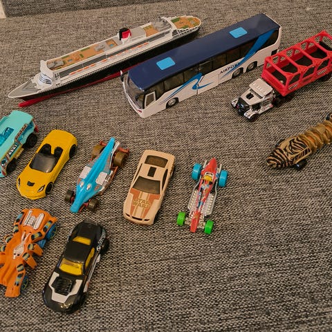- 1 Hot Wheels mönkijä + toinen mönkijä, - 1 transformers-robotti + isompi autosta robotiksi muuntuva lelu