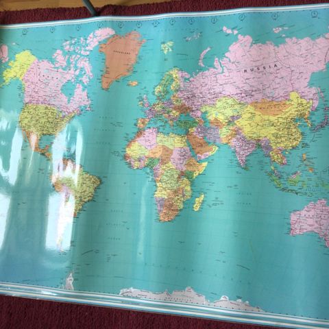 Maailmankartta, jossa Afrikan mantere on korostettuna. Juliste sisältää maantieteellisiä tietoja Afrikasta, kuten maiden rajat ja pääkaupungit. Lev.n.130cm kork.n.180cm