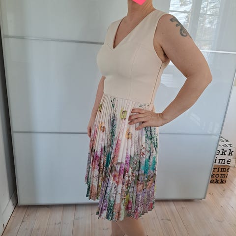 Kaunis Ted Baker juhlamekko. Pituus niskasta helmaan 123cm. Vyötärön kohdalta ympärys n. 74cm. Materiaali sekä päällinen että vuori 100% viskoosi. Pääntiellä ja hihansuissa sekä hihoissa koristeellinen nirkkoreunus. Kokonaan vuoritettu ja takana pitkä vetoketju. Vyötäröllä nauhat, jotka solmittavissa eteen tai taakse. Käytetty pesulassa, joten mekko käyttövalmis.