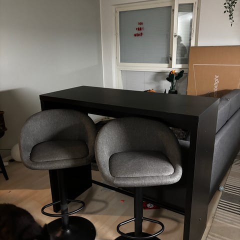 Pöytää ei enää Jyskin valikoimassa, tuolit https://jysk.fi/ruokailutila/baarituolit-ja-jakkarat/baarituoli-jonstrup-musta-keinonahka/luonn-tammenvarinen