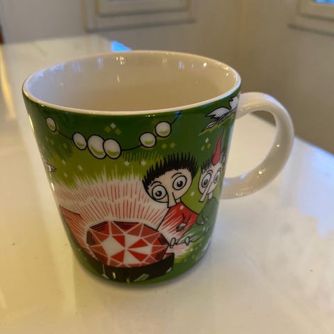 Arabia Muumi muki, sininen väri, valmistettu keraamisesta materiaalista. Mukissa on Muumi-aiheinen kuvitus. Soveltuu päivittäiseen käyttöön.