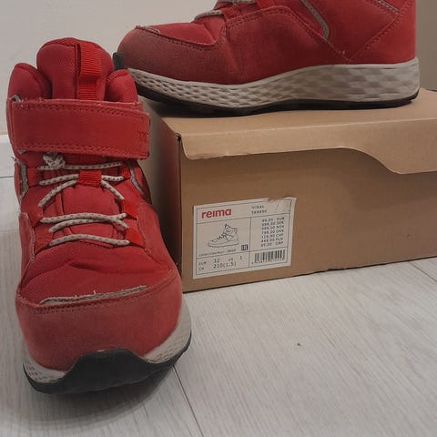 Reima lasten kengät, koko 32, unisex. Kengät ovat väriltään tummanpunaiset ja pinkit, materiaali sisältää tekstiiliä ja synteettisiä materiaaleja. Varustettu tarrakiinnityksellä ja tukevalla kumipohjalla, soveltuvat lasten arkikäyttöön.
