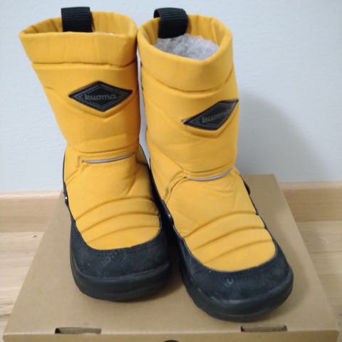 Kuoman putkivarsi talvikengät heijastavalla rataskuviolla ja villavuorella. Olleet yhden talven aikana käytössä yhdellä lapsella toisina kenkinä lähinnä kovimpien pakkasten aikaan. Erittäin hyvä käytetty kunto.