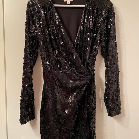 Upea etupuolelta kauttaaltaan koristeltu olkaimeton paljettimekko. Taustapuoli on kangasta ja siinä on koko pituudeltaan vetoketju. Yläreunassa on silikoninauha joka pitää mekkoa paikallaan. Kangas joustaa jonkun verran. Mekko on uusi ja käyttämätön. Väri musta. Yläreunan ymärys 88 cm (kainaloiden alta mitattuna), mekon pituus 72 cm.