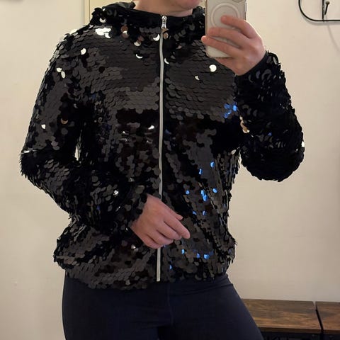 GUESS Hihaton Toppi, koko L, musta väri. Topissa on kiinnitettyjä paljetteja, jotka lisäävät pintaan kiiltoa. Materiaalina on kevyt ja joustava kangas, sopii naisten käyttöön. Toppi on suunniteltu istuvaksi ja sopii erilaisiin rentoihin ja juhlavampiin tilaisuuksiin.