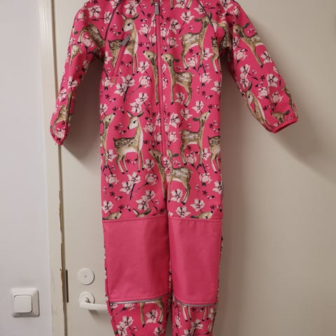 Jonathan lasten softshell-haalari, koko 116, unisex. Haalarissa on kirjava eläinkuosi ja mustat vahvistetut polvet sekä takapuoli. Sisäpuolella fleecevuori. Pieniä käytön jälkiä vasemmassa lahkeessa (paikattavissa pienillä vaatelaastareilla tms.), muuten täysin ehjä. Jalkalenkit puuttuvat mutta napit jalkalenkkien kiinnittämiselle ovat tallessa.