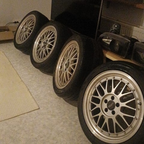 Vanteissa on kulumaa maalipinnassa, mutta eivät vaikuttaisi olevan lommolla. Päällä kohtalaiset kesärenkaat joista kylläkin yksi ainakin on syönyt sisäsyrjää huonojen suuntausten vuoksi. Näillä kyllä ajaa vielä hetken, mutta takarenkaisiin kannattaa ainakin vaihtaa kumit jossain vaiheessa.