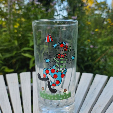 Kuvan mukaiset juomalasit. Korkeus 145 mm ja halkaisija 65 mm. Toisen lasin värit haalistuneet (konepesussa). Käsinpesu.