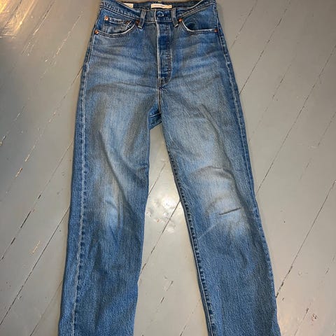 Myydään hyväkuntoiset Levi's 501 farkut. Väri on kulutettu sininen, ysärityylinen väri.