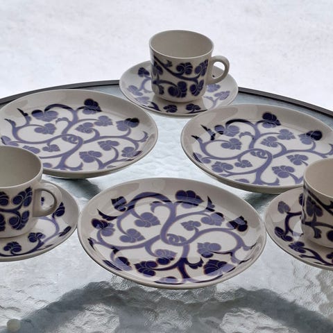 Arabian valmistamia, Laila Hakalan suunnittelemia Lyydia astioita. Viisi kappaletta kahvikuppia, asettia ja pullalautasta. Sokerikko ja kermakko ja iso taroilulautanen. Astiat kestävät konepesun. Voin postittaa, postitusmaksu on 10 euroa. Yhteishinta kaikille 145.00 euroa.