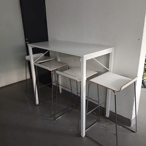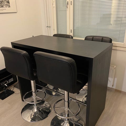 Myydään hyvässä kunnossa oleva ruokailuryhmä baaripöydällä ja baarituoleilla, yhteensä 4 kpl.