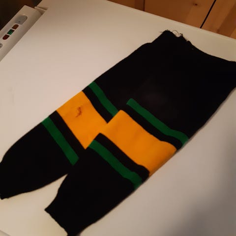Lapsella käytössä olleet pelisukat, toisessa sukassa neulos hieman purkautunut. Vain nouto.