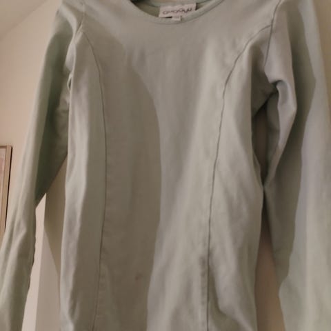 Gugguu 140 haaleanminttu/haaleanturkoosi trikoopaita. Pidempi kapeahko malli, vastaa minusta kokoa 134. Helmassa reunoissa vetoketjut. Erinomainen kunto kaikinpuolin. Ihan pieni lankapako kauluksessa. Meille uutena hankittu.