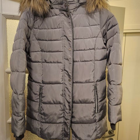 Valkoinen, vähän kiiltävä toppatakki. Kiva kaulus.