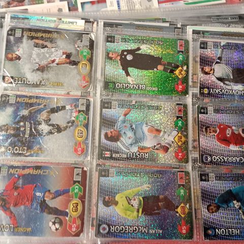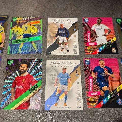 Kokoelma jalkapallokortteja, joissa on eri pelaajia ja joukkueita.