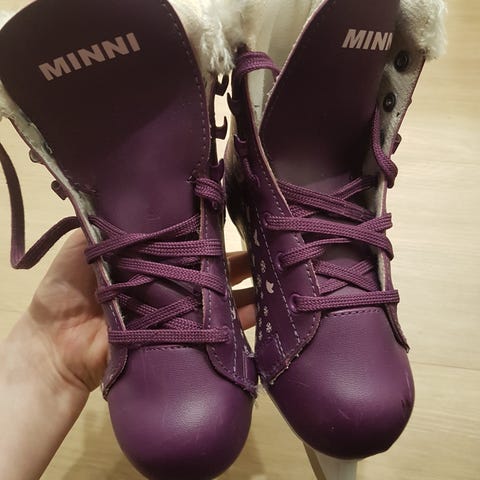Vaaleanpunaiset Minni luistimet koko 28. Hyvä käytetty kunto, yksi tahra, näkyy kuvassa.