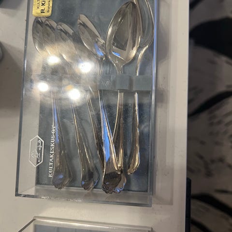Kaksi rasiaa, eli 12 kpl uushopeaa sisältävät ruusulusikat alkuperäisessä rasiassa. Leimat lusikoissa.