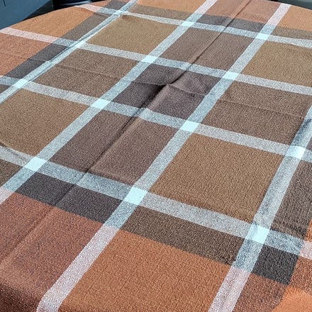 Oranssiruskea retro liina, oletettavasti kotimainen. Koko n. 88.5cm x 86.5cm. Kankaan pinnassa elävyyttä ja langan sävyeroja myös eli ei ole likaa. Ostaja maksaa postikulut ja noutaakin voi Tampereelta.