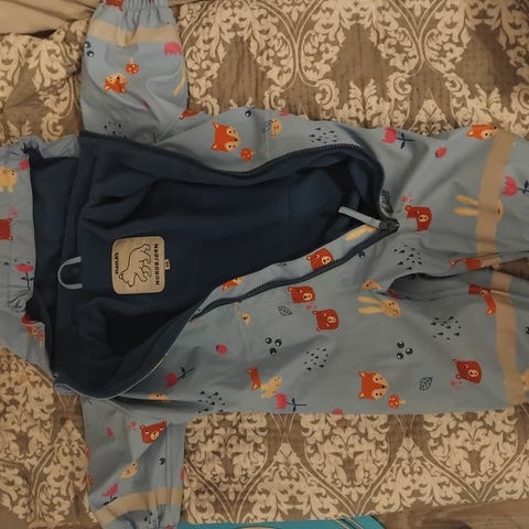 Fleece vuorellinen Petit Cherien kurahaalari irroitettavalla hupulla. Yksi hupun neppari vaihdettu.