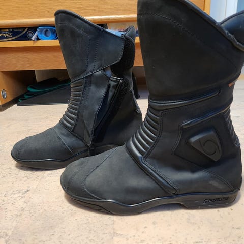 Course Moottoripyöräsaappaat mustaa nahkaa, koko 44. Saappaat on suunniteltu tarjoamaan suojaa ja mukavuutta moottoripyöräilyyn. Niissä on vahvistetut alueet ja tukeva rakenne.