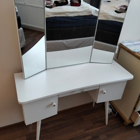 Ehjä kampauspöytä tuolin kanssa. Sivupeilit taittuu ja peilit irroitettavissa.