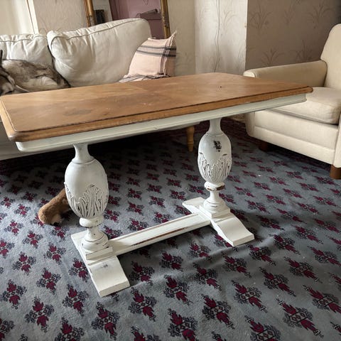 Vanha puinen ovaalin muotoinen sohvapöytä. Koristeellinen jalka. Ollut varastossa.