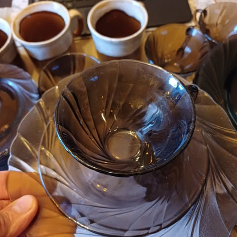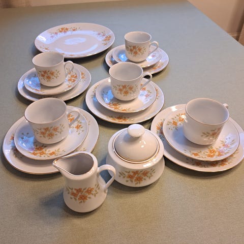 Kahviastiasto, somistettu ruskealla kukkakuvioinnilla, nimeltään "Bernadotte". Valmistettu Tsekkoslovakiassa.