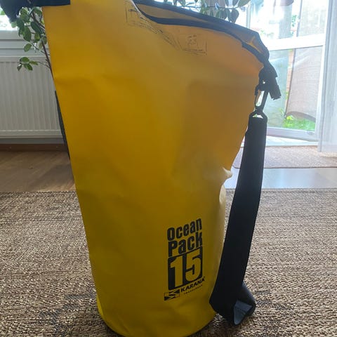 Kajakin suojapussin kuljetuslaukku. Nelo, värit punainen ja keltainen. Laukussa mustat kantokahvat.