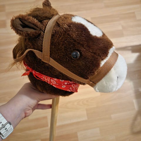 Tyttären tekemä keppihevonen ja pinkki kaupasta ostettu riimu ja talutin.
