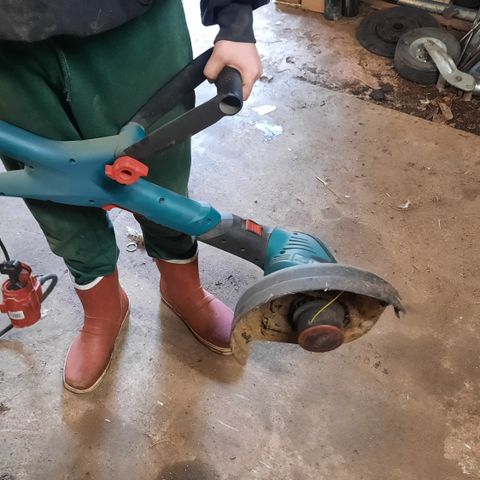 Sähköinen ruohotrimmeri, leikkuuleveys 26 cm, sininen väri. Trimmerissä on säädettävä kahva ja kevyt runko, sopii nurmikon ja reuna-alueiden leikkaamiseen. Käytetty laite, näkyvää kulumaa ja likaa käytön jäljiltä. 3 akkua ja laturi mukaan