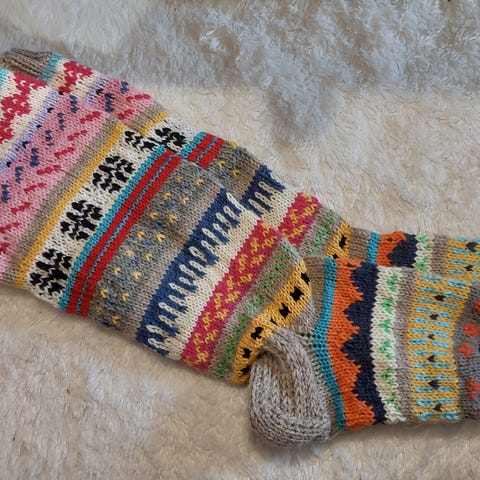 Kutomani värikkäät villasukat. Lämpöä varpaista polviin. Koko 37/38