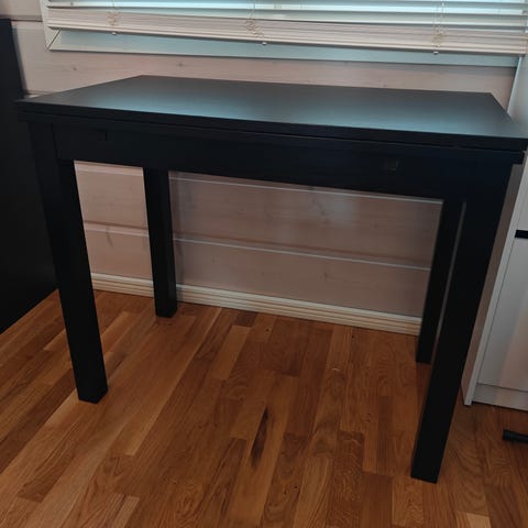 Myydään laajennettava luonnonvalkoinen puupöytä. Maalipinnassa käytön jälkiä. Sivupalat saa kätevästi keskikohdan alle.