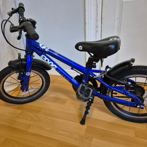 lasten polkupyörä oranssilla värillä. Pyörä on tarkoitettu lapsille ja siinä on 16 tuuman renkaat. Runko on valmistettu kestävästä materiaalista, ja pyörässä on takana lokasuoja.
