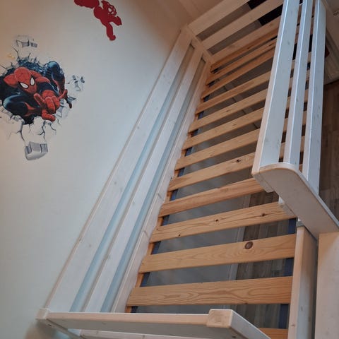 Askosta ostettu valkoinen, tukeva parvisänky lapselle. Muuten siisti käytetty kunto (pientä käytönjälkeä, esim. parissa kohdassa tarroja tai liimajälkiä tarroista), mutta pohjan laudoista yksi haljennut, katso kuva. Patjakoko 90x200 cm. Nouto Hervannasta, puretaan valmiiksi osiin. Kokoamisohjeet tallessa.