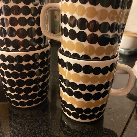 Vähäisessä käytössä olleet virheettömät Marimekon Oiva Siirtolapuutarha -mukit, myydään yhdessä tai erikseen, 6e/kpl tai 12e/molemmat.