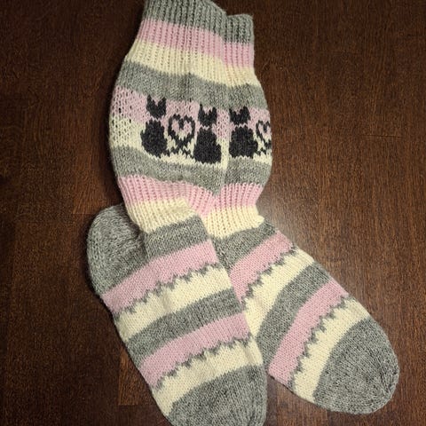 Novita Nalle-langasta neulotut villasukat koko n.32, jalkapohjan pituus 21cm. Vahvistettu kantapää, kissa-kuvio varret. Uudet ja siisti. Nouto Noljakasta.