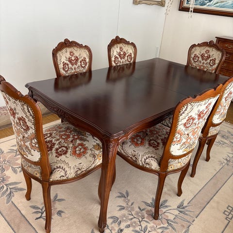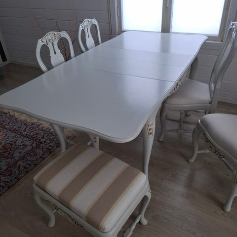 Talonpoikaisrokokoo ruokapöytä ja tuolit