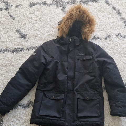 True North musta toppatakki, koko 158-164cm. Takki on unisex-malli, sopii sekä tytöille että pojille. Takissa on irrotettava huppu, jossa on karvareunus. Kunto hyvä, en löytänyt tahroja tai reikiä. Vetskari toimii.