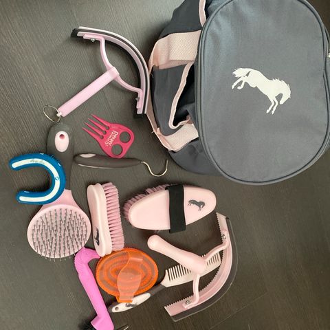 Myynnissä kuvan harjalaukku ja harjoja. Laukku on puhdas, myös harjat pääpuolin. Muutamassa harjassa on pientä likaa, mutta ei suurta, kun harjoja on käytetty aikanaan vain leikeissä.