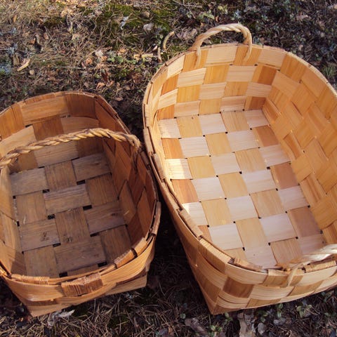 Pärekorin mitat: korkeus 54 cm (kahva mukana), leveys 34 cm, syvyys 44 cm. Pohjassa tahra, muuten ehjä.
