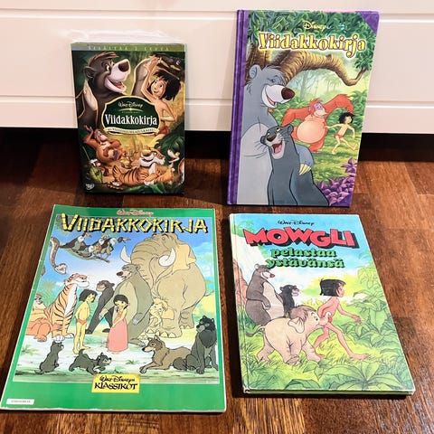 The Jungle Book Viidakkokirja lastenkirja sisältää tarinan Mowglin seikkailuista viidakossa. Kirja on suomenkielinen ja sisältää värillisiä kuvituksia. Julkaisija on Kirjalito. Kurkistuskirja.