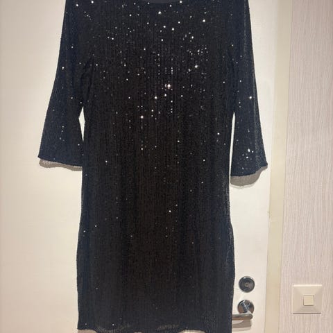 H&M naisten mekko, väri sininen, koko XL. Mekossa on lyhyet hihat ja vyötäröllä koristeellinen solki. Takana vetoketju.