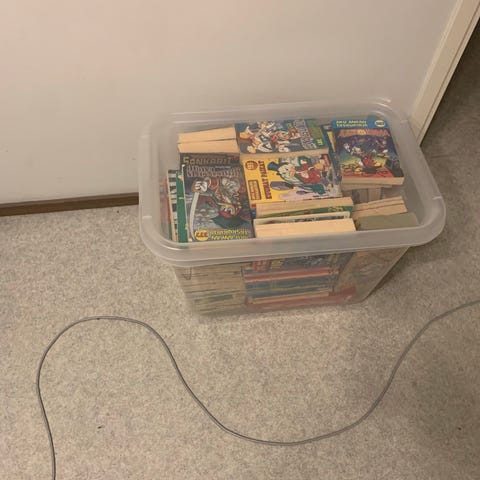 Aku Ankka sarjakuvalehti kokoelma säilytettynä läpinäkyvässä muovilaatikossa.